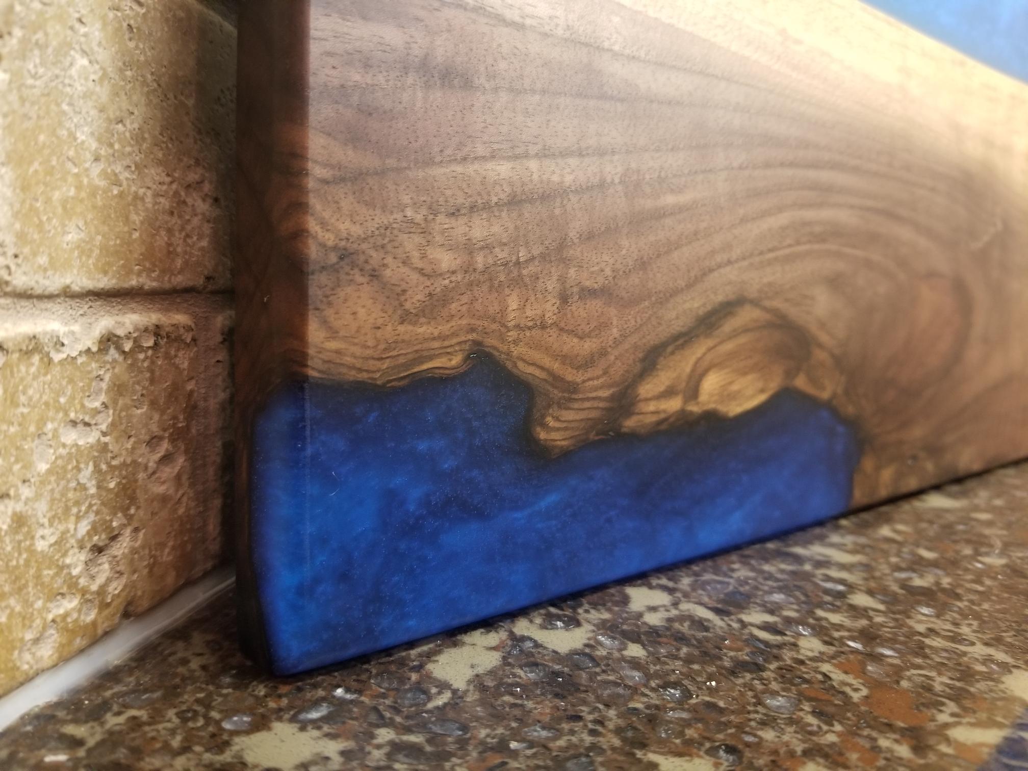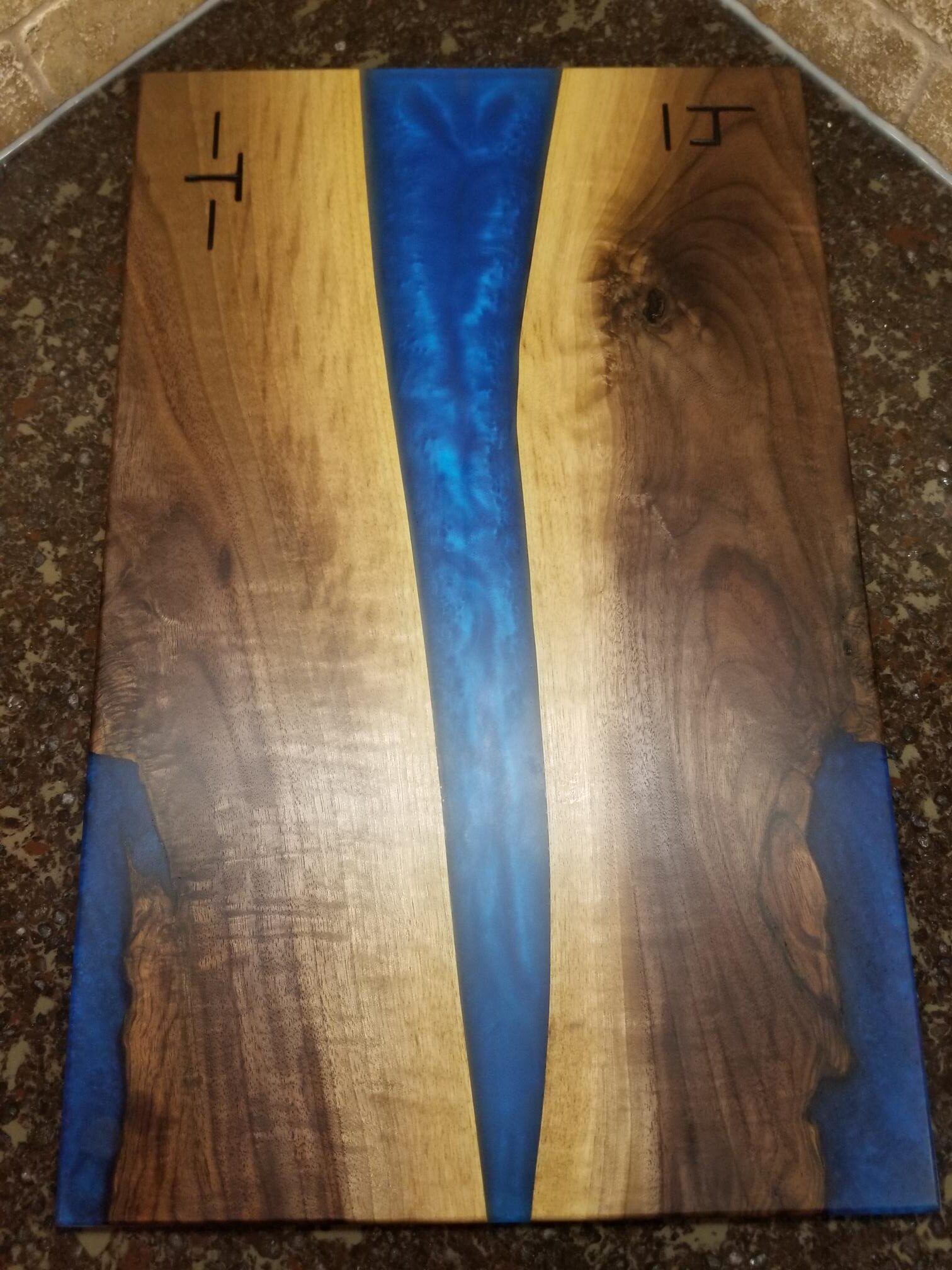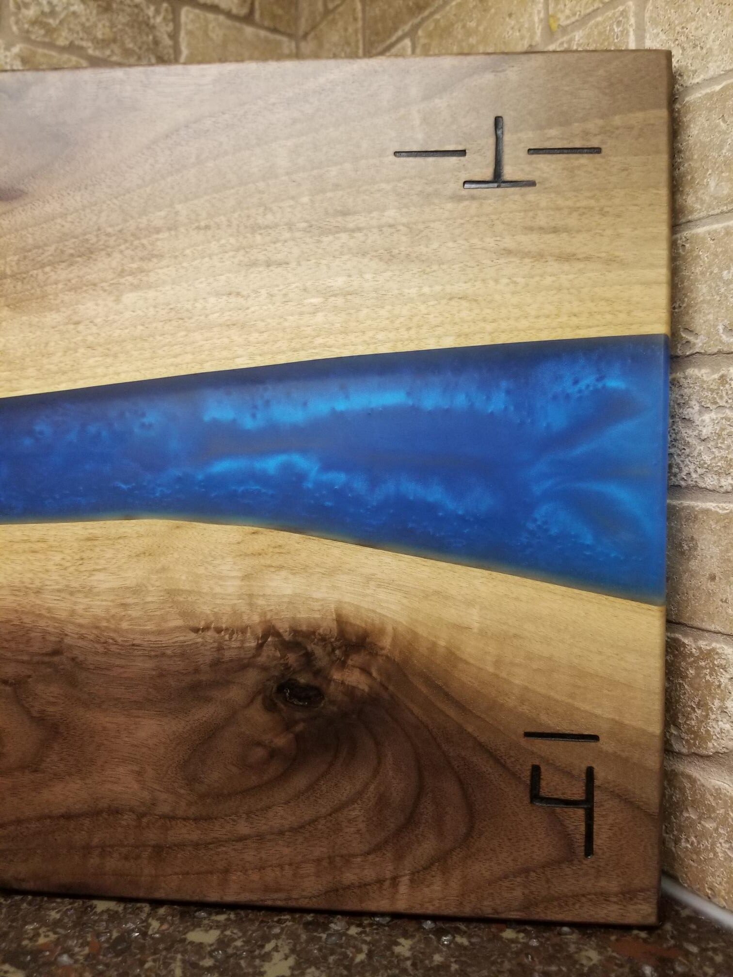 Blue Epoxy Between Black Walnut Wood with Customer’s Cow and Horse Brands Front Back Side Top Horse and Cattle Brands Corner detail Detail