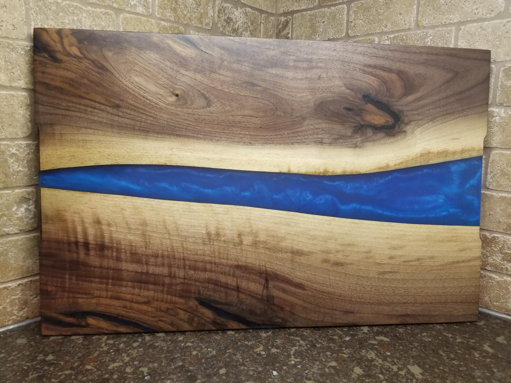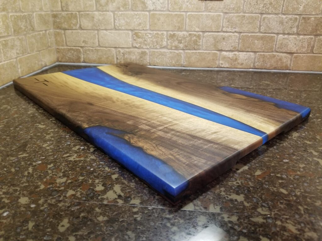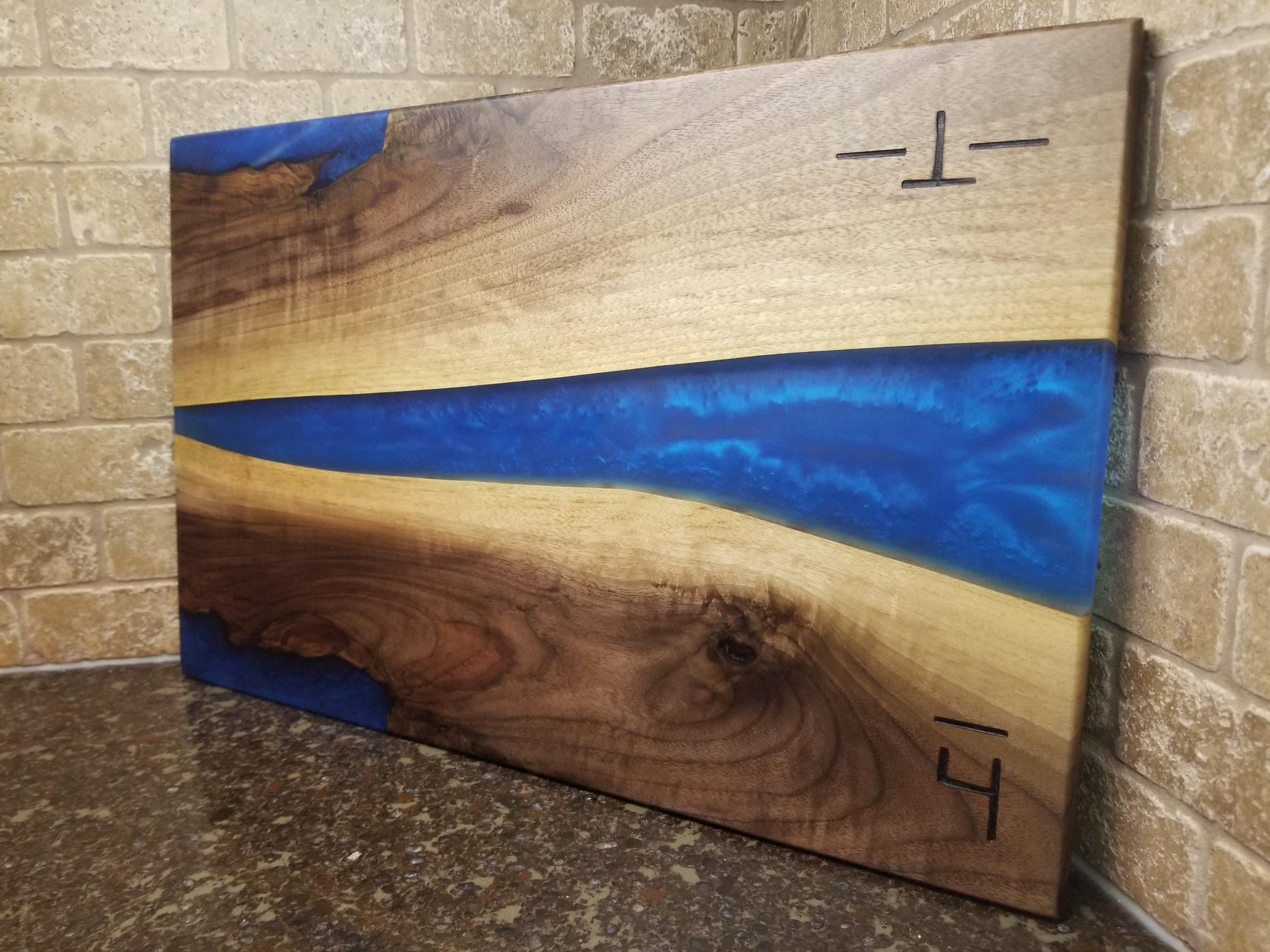 Blue Epoxy Between Black Walnut Wood with Customer’s Cow and Horse Brands Front Back Side Top Horse and Cattle Brands Corner detail Detail